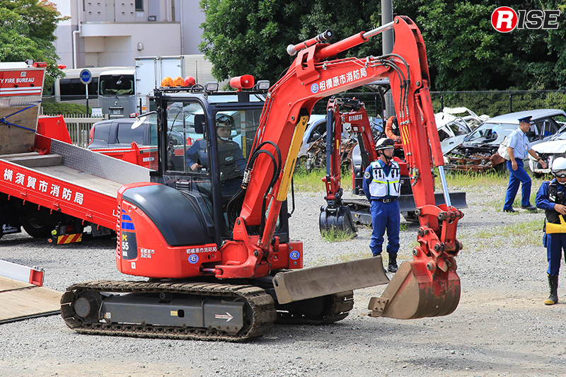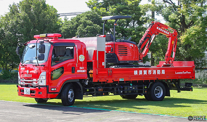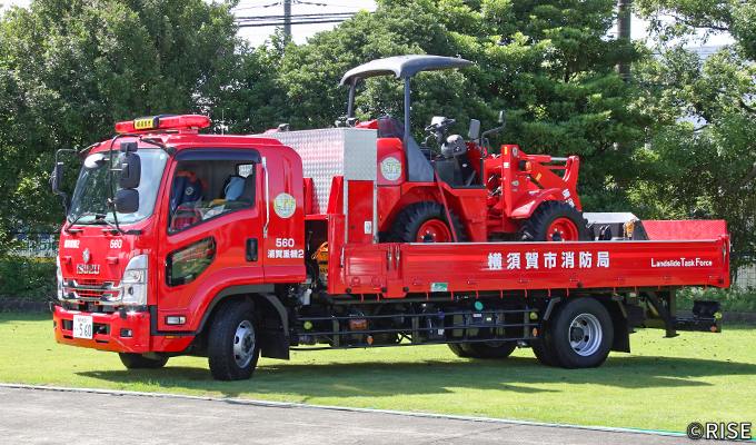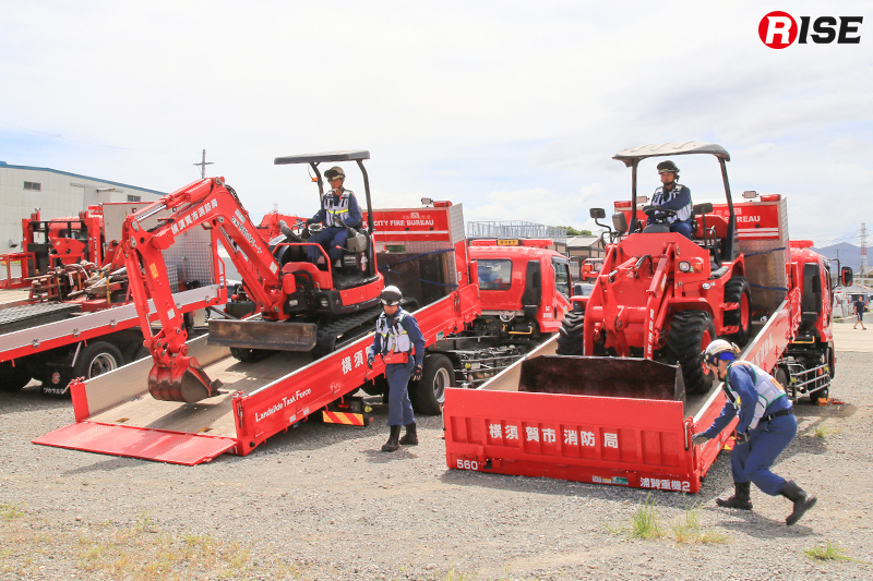 横須賀市消防局では令和3年に油圧ショベルとホイルローダーの寄贈を受け、重機の運用を開始した。油圧ショベルが土砂や瓦礫などの排除を行い、排除された障害物をホイルローダーが後方へ移動させることで、活動を途切れることなく継続することができる。こうしたコンセプトから、作業性や機動性の高いコンパクトな重機2台のペアという運用を行っている。後に、重機搬送車を新たに整備するとともに、令和5年4月に土砂災害機動部隊「LTF(Land slide Task Force)」を発足させ、重機運用体制の強化を図っている。