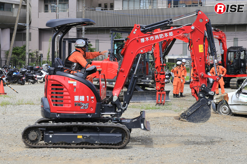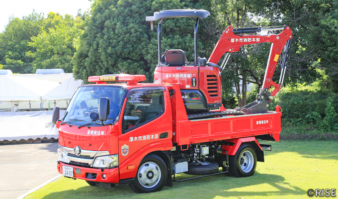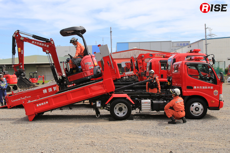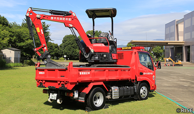 各地で多発する大規模地震や激甚化する自然災害を踏まえ、これら自然災害に対し安全かつ的確、そして迅速に対応することを目的とし、厚木市消防本部では令和6年に3t重機及び重機搬送車を整備した。土砂災害発生時の消防隊員の進路や活動スペース確保、倒壊建物に取り残された要救助者の救出に活用すべく、小型車両系建設機械の運転にかかる特別教育を受講し、日々の訓練を重ねた精鋭隊員が運用を行っている。