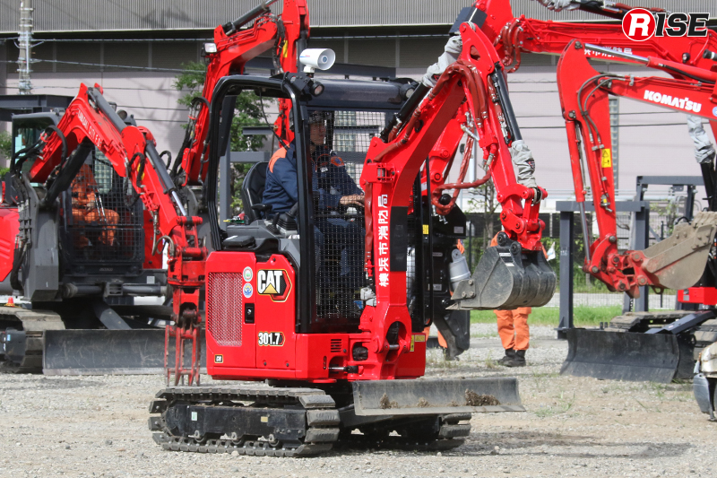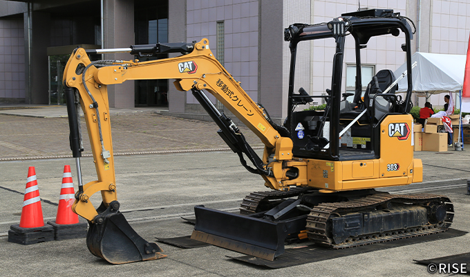 指導会会場ではメーカーによる機体展示も実施された。写真は日本キャタピラー製のクローラ式油圧ショベル303CR。遠隔操作装置を搭載しており、遠隔操作のデモンストレーションが実施された。