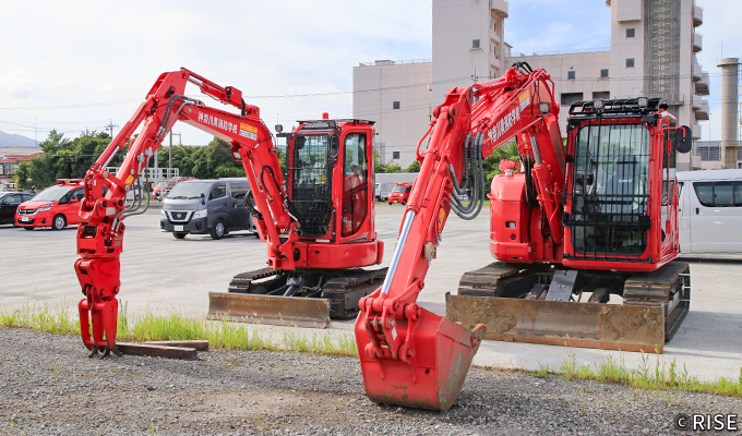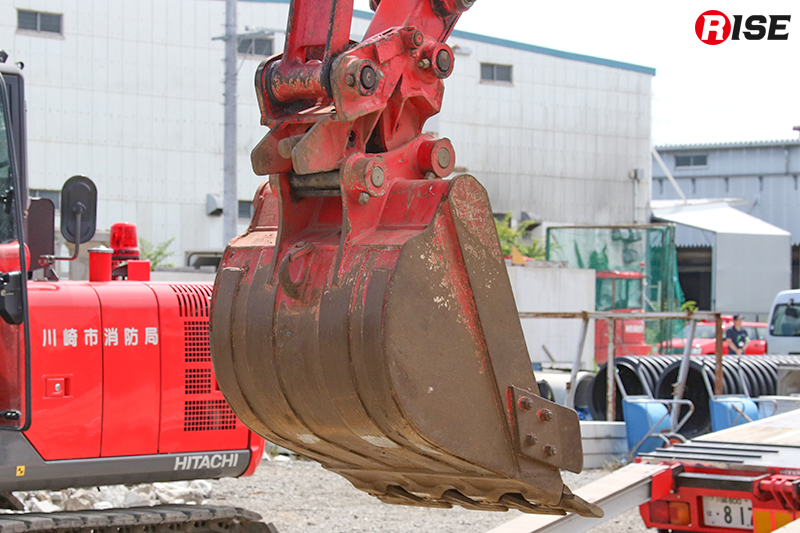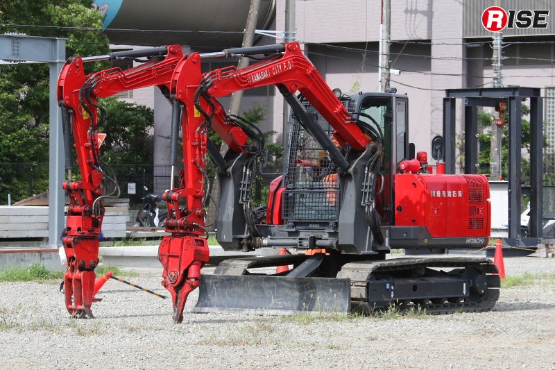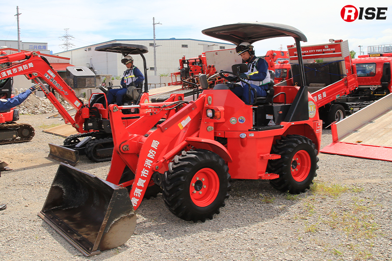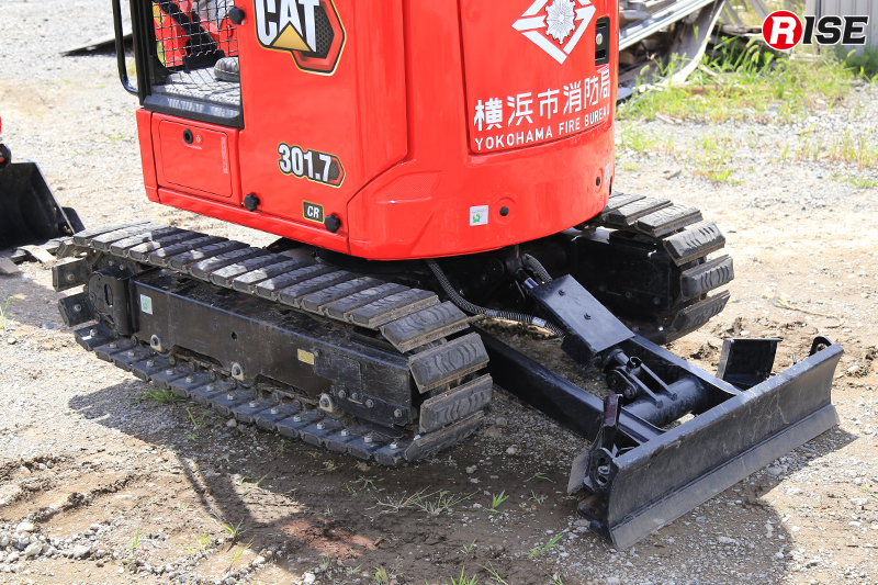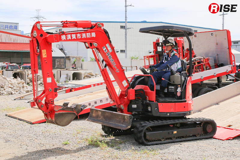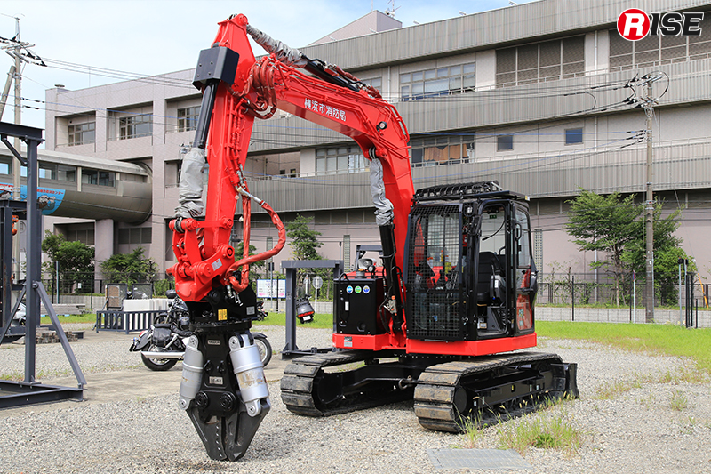 緊急消防援助隊の無償使用装備として配備されている重機は3t級と5t級2タイプで、バケットのほか油圧旋回フォークや油圧ブレーカー、油圧切断機などに交換が可能。また、アーム部分に固定式管鎗を装備しており、自走式放水砲としても活用できる。加えて、ラジコンによる遠隔操作機能も備えており、隊員の接近が困難な危険地帯での活動を可能にする仕様となっている。