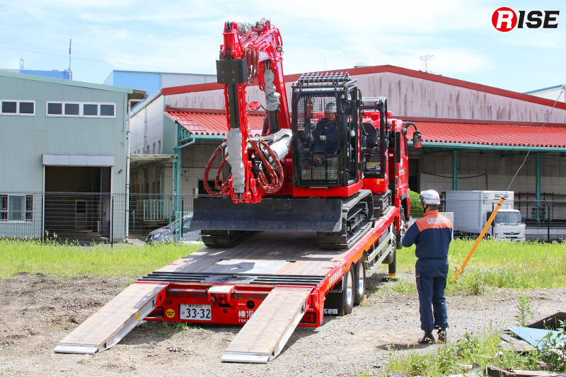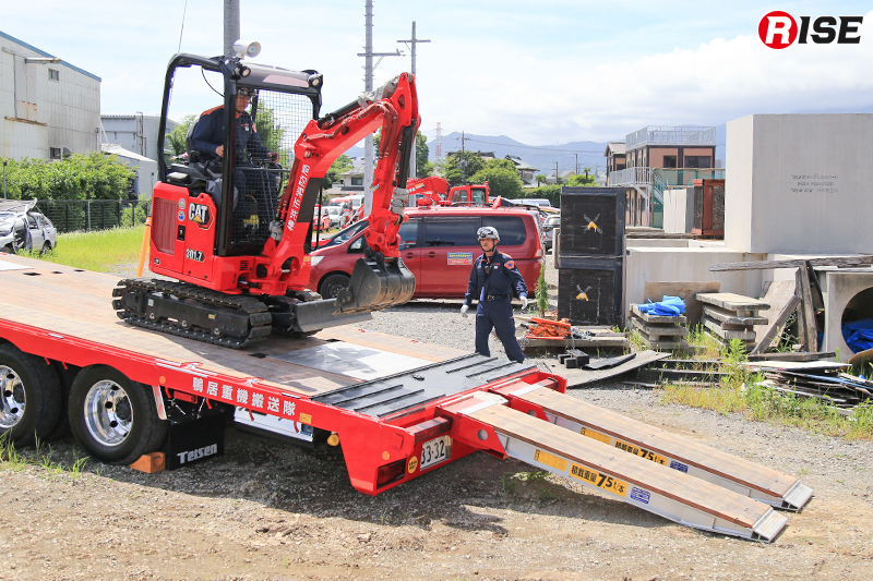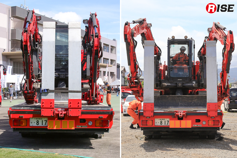 搬送車はスライドキャリア方式を採用し、重機やアタッチメントを迅速に運搬・展開できる仕様で、搭載したクレーン装置により現場での重量物排除にも対応可能となっている。