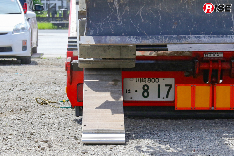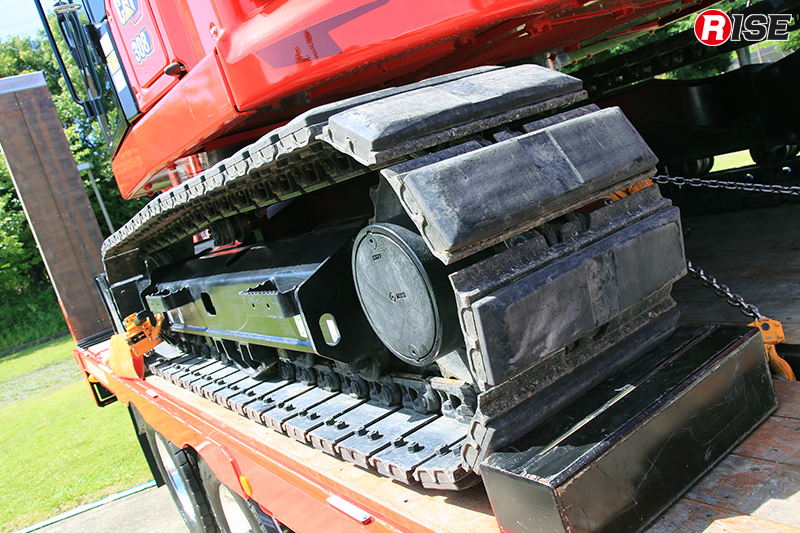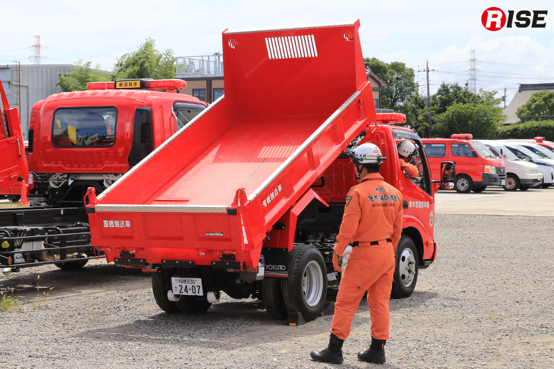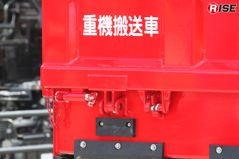 特筆すべきは重機搬送車の仕様。極東開発工業製のスライドダンプを採用しており、ダンプ機構とスライド機構の2つの機構を併せ持っているのが特徴だ。現場では重機搬送車としてスムーズに重機の積み下ろしができるだけでなく、最大積載量3000kgのダンプカーとして、重機により排除した土砂などの後方搬送を担うことができる。
