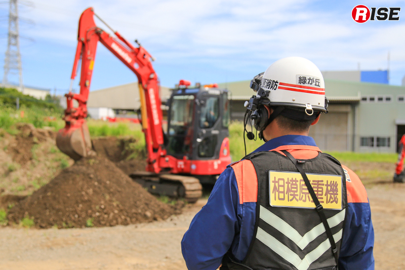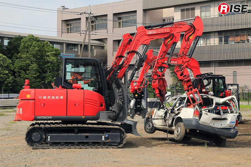 訓練会場となった土砂災害訓練施設の脇には、神奈川県消防学校が保有する救助訓練用重機(油圧ショベル2台)が置かれていた。これは重機の操作習熟用として令和6年に整備されたもので、アーム先端のアタッチメントを交換することで、掘る、砕く、掴む、切るといった作業が可能。いずれもコベルコ建機製で写真右が7t級のSK75SRDで、写真左が3.5t級のSK35SR。