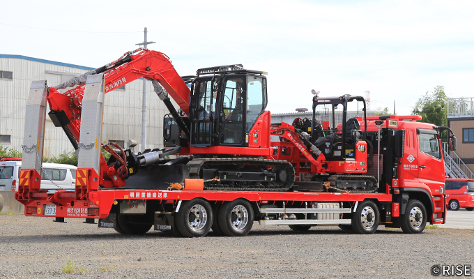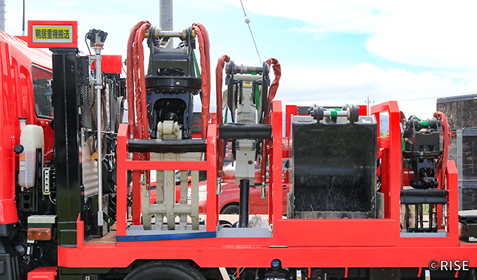 重機2台と各種アタッチメントを一括して搬送するのが重機搬送車だ。三菱ふそう・スーパーグレートをベースに製作されており、油圧ジャッキにより車体を傾斜させて重機の積み下ろしを行う。荷台キャブ寄りに小型重機とアタッチメントラック、後方に中型重機がレイアウトされている。