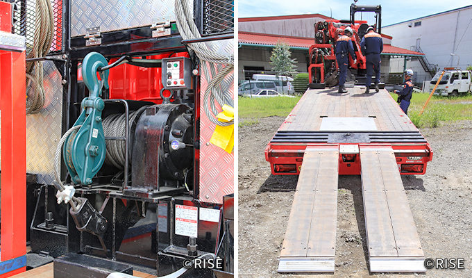 鳥居部分にウインチを装備(写真左)。あゆみ板は履帯間隔にあわせて調整可能(写真右)。