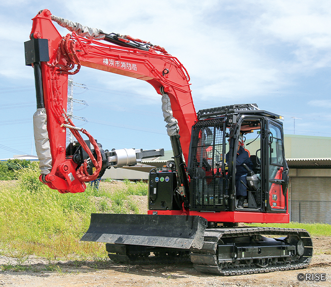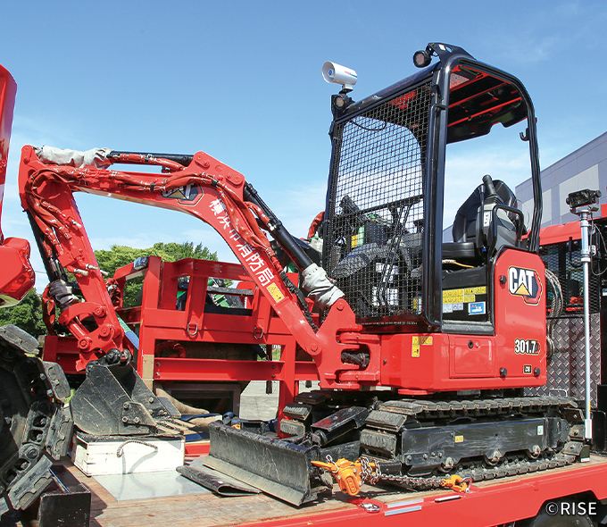 採用された重機は日本キャタピラー製のクローラ式油圧ショベル308CR(中型機)と301.7CR(小型機)。クラスの異なる2機を備えることで、あらゆる現場環境へ対応できる能力を目指した。先端アタッチメントについては2機ともバケット、グラブ、ブレーカーが用意されており、中型機は鉄筋カッターも備える。アタッチメントはラックに載せた状態で交換が可能となっており、重機が自己完結的に付け替えることができる。