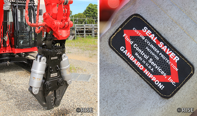 中型機にセットされた強力な鉄筋カッター(写真左)。いずれの重機にも「シリンダーシールセーバー」としてシリンダー部分を保護するグレーのカバーを装着(写真右)。