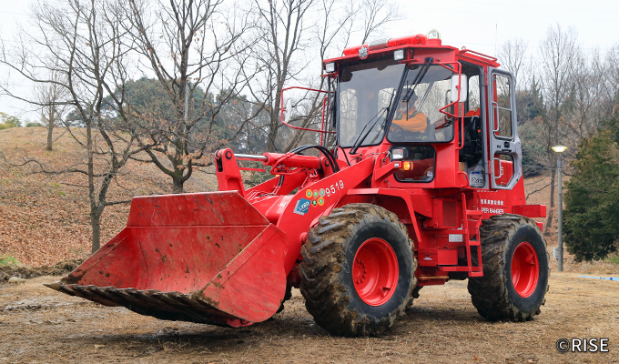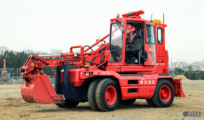 [排除作業車/特別高度救助部隊] ホイルローダーをベースとした排除作業車。元々は1995年(平成7年)に震災作業車として導入され、西消防署浅間町消防出張所に配備。後に特別高度救助部隊の発隊に伴い同隊に配置転換され、名称も排除作業車に改められた。震災時の道路啓開を主任務としており、大型バケットや排土板にて土砂や瓦礫等の重量物排除が可能。こちらも2名乗車可能な改造が施されていた。