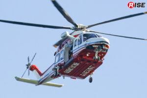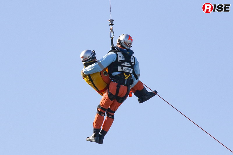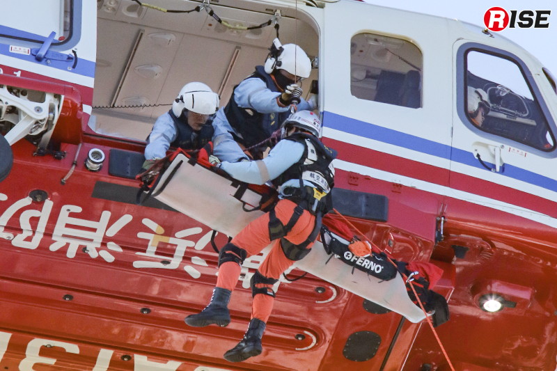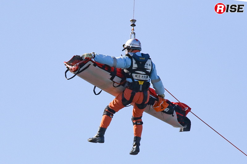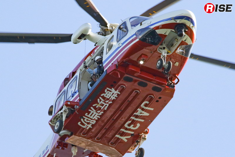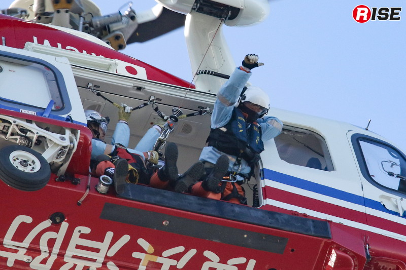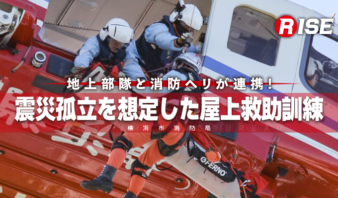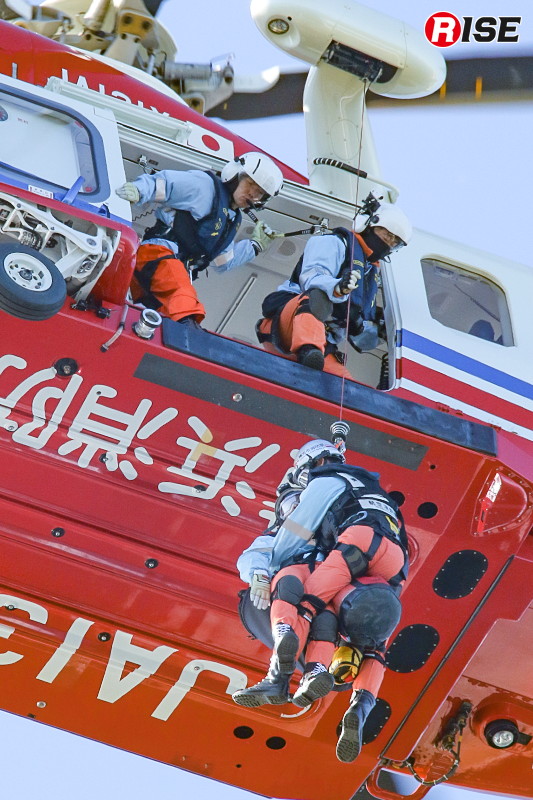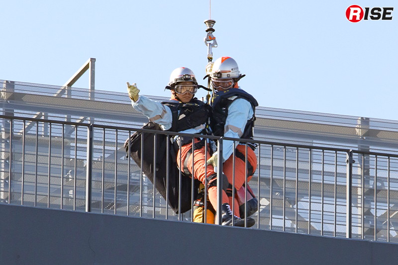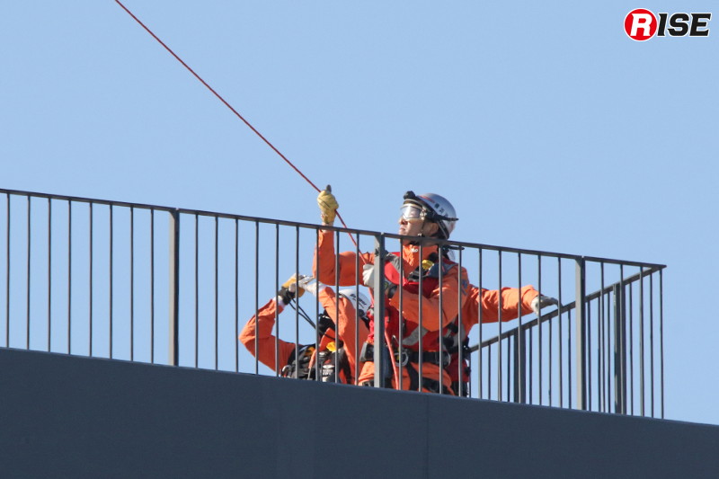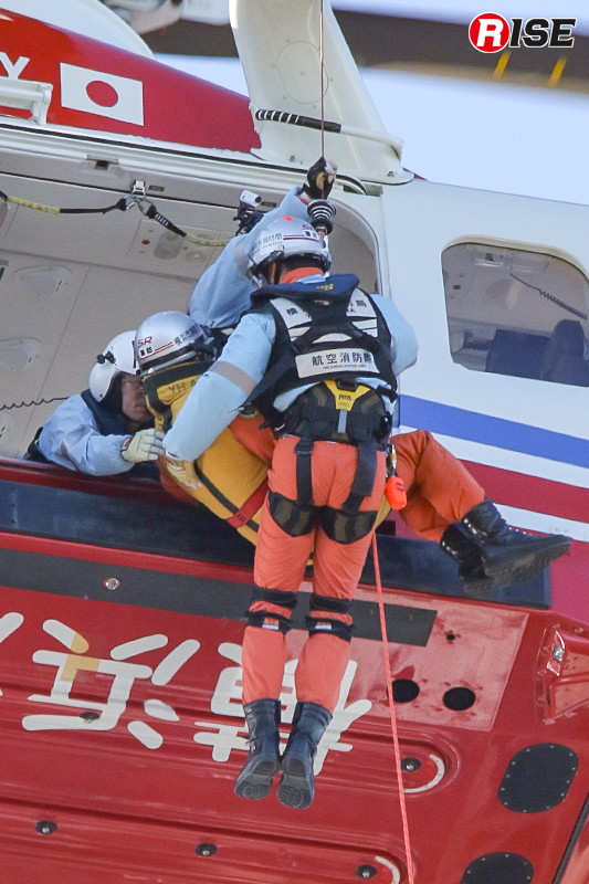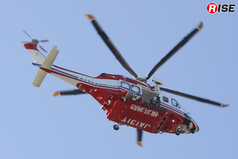 現場上空に進入した消防ヘリ「はまちどり1」は一定高度でホバリングを行い、隊員2名をホイストにより降下させた。降下した隊員は屋上にて要救助者の状況確認等を実施し、その後、再進入した機体から追加隊員が降下して収容体制を整えた。